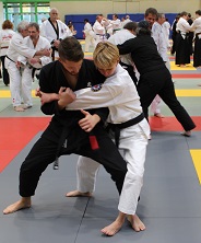 Am frühen Samstagvormittag füllte sich die Halle von Minute zu Minute mehr, sodass zum Beginn des Lehrgangs rund 120 Großmeister und Teilnehmer die Tatami füllten. Nach den herzlichen Grußworten von Konsul Shinsuke Toda aus dem Japanischen Generalkonsulat und dem Düsseldorfer Stadtdirektor und Sportdezernent Burkhard Hintzsche, wurde der Lehrgang durch Charlie Lenz (9. Dan Jiu-Jitsu), Präsident der EJJU für eröffnet erklärt. Burkhard Hintzsche, welcher u.a. Ehrenmitglied des Sakura-Dojo ist bekam einen schwarzen Gi, mit eingesticktem goldenem Emblem von Kalla Bergers überreicht. Nach dem offiziellen Angrüßen wurde der Lehrgang mit einem gemeinsamen Aufwärmtraining begonnen, bevor sich auf drei Tatami die anwesenden Meister abwechselten um ihr Können an die anwesenden Schüler weiter zu geben. Besonders unsere diesjährige Hauptreferentin Mónica Couto (6. Dan Jujitsu, Bodyguard und Self Defense Instructor) erfreute mir ihrem Team wieder einmal alle Teilnehmer und im Speziellen alle weiblichen Budokas mit ihren speziellen Einheiten im Bereich Frauenselbstverteidigung. Um 18:00 Uhr neigte sich ein trainingsreicher Tag seinem sportlichen Ende, aber es sollte noch lange nicht Schluss sein. Pünktlich um 19:00 Uhr wurde das reichhaltige Buffet eröffnet, alle Anwesenden hatten so die Möglichkeit wieder Energie zu tanken. Auch einige Ehrungen standen noch an, so wurde der langjährige Begleiter des Sakura-Dojo, Prof. Dr. med. Andreas Meyer-Falcke ebenfalls ein schwarzer Gi, mit eingesticktem goldenem Emblem überreicht und Marek Roclawski, sowie Geza Szepvoglyi in den Stand der Tanto-Träger gehoben. Nachdem noch weitere Meister einige Ehrungen ausgesprochen hatten begann der gemütliche Teil des Abends mit Live-Musik, Tanz, guten Gesprächen und ein wenig Alkohol. So wurde bis in die frühen Morgenstunden gefeiert.