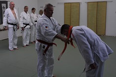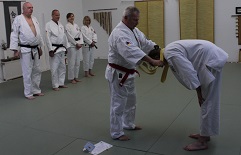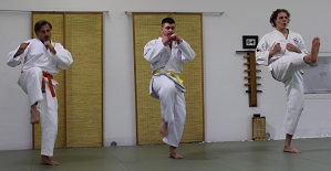Um Punkt 15:00 Uhr stellten sich drei Prüflinge der Herausforderung und strebten die nächsthöhere Graduierung an. Unter Leitung von Sensei Kalla Bergers begannen sie mit der Vorstellung der Fallschule, um im weiteren Verlauf die Karatetechniken, Würfe, Hebel, sowie für die höheren Kyu-Graduierungen die Würgetechniken der Prüfungskommission vorzuführen.